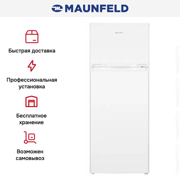 Maunfeld MFF143W — небольшой отдельно стоящий двухкамерный холодильник в корпусе белого цвета. Модель высотой 143 см и шириной 54 см с верхней морозильной камерой — хороший вариант для установки в небольшой кухне, студии, на даче. Корпус изготовлен из металла с покрытием из эмали, дверной упор расположен справа, но имеется возможность его переноса на левую сторону. Климатический класс ST свидетельствует, что прибор будет стабильно работать при температуре окружающей среды от + 18 до + 38 градусов. Высокий класс энергопотребления A+ гарантирует малый расход электроэнергии.