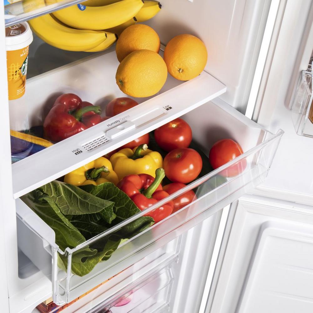 Для хранения продуктов в холодильной камере предусмотрены три стеклянные полки с металлической окантовкой, четыре полки на дверце и подвесная металлическая полка для бутылок. Овощи и фрукты можно хранить в выдвижном ящике в нижней части холодильного отделения, а мясо, рыбу, сыры и масло — в расположенной над ним на свежести с нулевой температурой и регулировкой влажности. В морозильной камере для размещения продуктов служат три выдвижных ящика из прозрачного пластика. Закрытая задняя панель позволяет устанавливать эту модель вплотную к стене.
