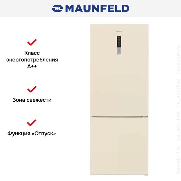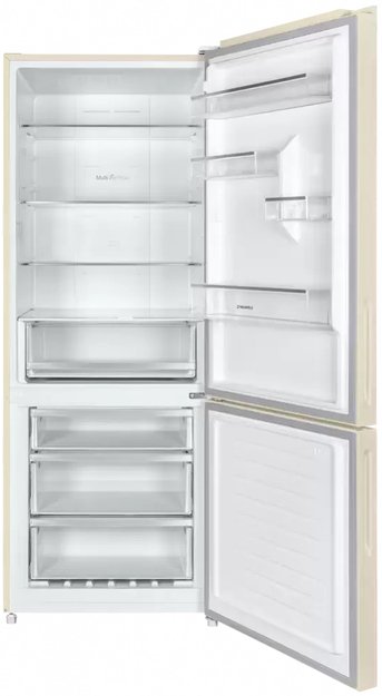 Двухкамерный отдельно стоящий холодильник Maunfeld MFF1857NFBG общим объемом 432 литра оснащен инверторным компрессором. Корпус бежевого цвета шириной 70 см и высотой 185 см изготовлен из эмалированной стали. Внутренняя поверхность камер выполнена из белого пластика с антибактериальным покрытием. Холодильник относится к климатическому классу ST и может стабильно работать при наружной температуре от +16°C до +38°С. Многопоточное охлаждение Multi Air Flow охватывает все пространство в камерах, так что температура везде остается одинаковой. Система размораживания Total No Frost препятствует образования наледи на стенках и способствует легкой и быстрой их очистке. Уровень шума составляет всего 42 дБ.