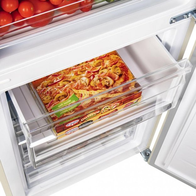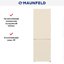 Maunfeld MFF185SFBG — отдельно стоящий двухкамерный холодильник высотой 185 см, шириной 60 см и объемом 317 литров. Такие габариты позволяют установить его как в просторной, так и в небольшой кухне. Металлический корпус окрашен в бежевый цвет, который хорошо сочетается с классическими интерьерами, фасад покрыт прочной глянцевой эмалью. Дверной упор находится справа, но его можно перенести в левую часть. Установить холодильник максимально ровно помогут регулируемые ножки. Модель относится к климатическому классу ST, диапазон допустимых температур окружающей среды для нее составляет от +16°C до +38°С. Компрессор стандартный, однако уровень шума во время работы очень низок и составляет всего 39 дБ. Экономичность холодильника удостоверяет класс энергопотребления A+. Особенностью приборов от Маунфелд является антибактериальное покрытие на внутренней поверхности камер: оно препятствует размножению вредоносных микроорганизмов и устраняет неприятные запахи. Размораживание этим холодильникам не требуется благодаря системе охлаждения Smart Frost, исключающей образование наледи на стенках.
