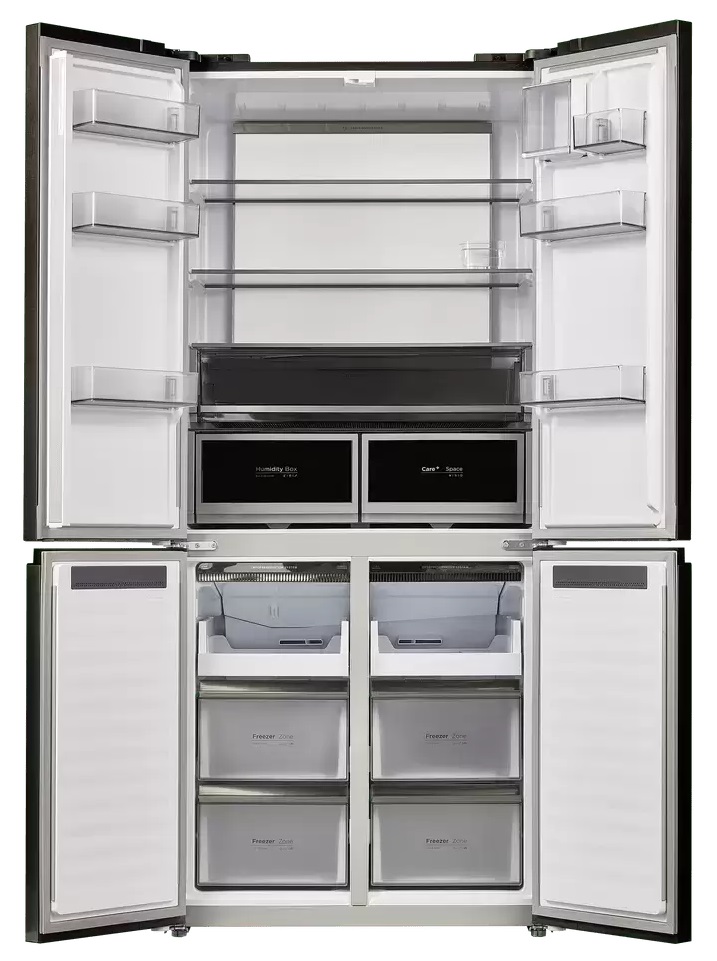 Четырех-, пяти- и шестикамерные модели включают, кроме морозильной и холодильной камер, отдельную зону свежести (иногда состоящую из сухого и влажного отсеков) и специальный отсек для ледогенератора, а в некоторых случаях еще и винное отделение.