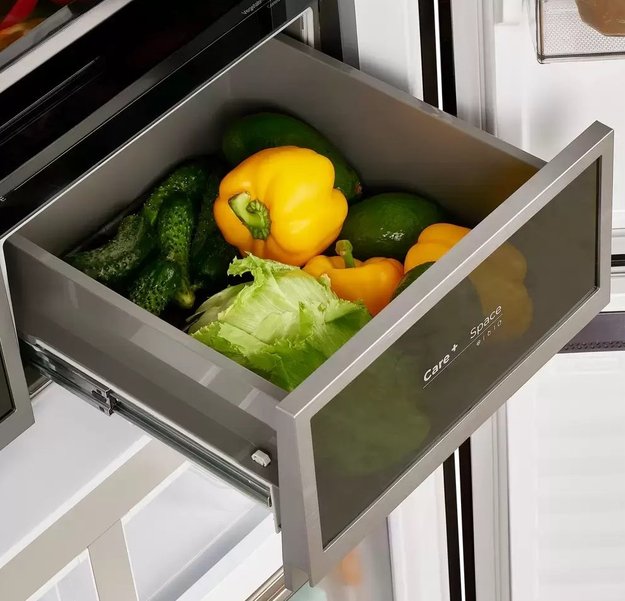 Вместительные контейнеры позволяют хранить достаточное количество овощей и фруктов. Для более длительного хранения и поддержания свежести овощей и фруктов разработаны специальные системы хранения. Среди них, например, зона свежести с увеличенной влажностью до 85% и температурой около 0 градусов. Это герметично закрывающийся ящик, часто на выдвижных роликах или направляющих, в котором имеется специальное задвижка, позволяющая регулировать влажность. Как известно, при более высокой влажности продукты с большим содержанием воды дольше остаются свежими.