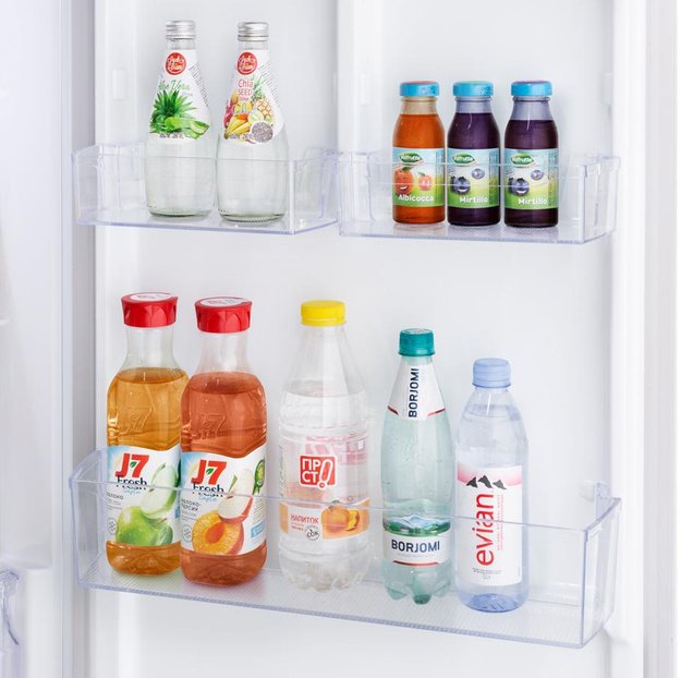 Прозрачный безопасный пластик позволяет сразу определить содержимое бутылки, если же пластиковый бортик имеет белый цвет, то между ним и металлической полосой остается достаточное расстояние, чтобы прочитать этикетку. Для еще более устойчивого размещения полки оснащаются разделителями-держателями.