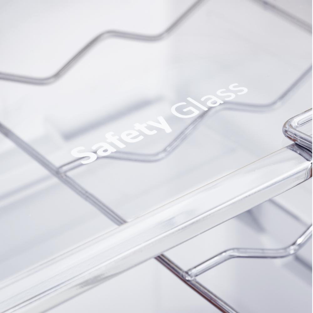 Оптимальным выбором является устройство со стеклянными полками. Закаленное стекло отличается высокой термостойкостью, устойчивостью к химическим и механическим воздействиям. Современные полки из ударопрочного стекла способны выдержать вес до 25 кг, они не пострадают при размещении на них металлической посуды. За ними легко ухаживать, а со временем стекло не желтеет и не портится. Стеклянные полки часто имеют пластиковую или металлическую окантовку, защищающую от пролитой жидкости.