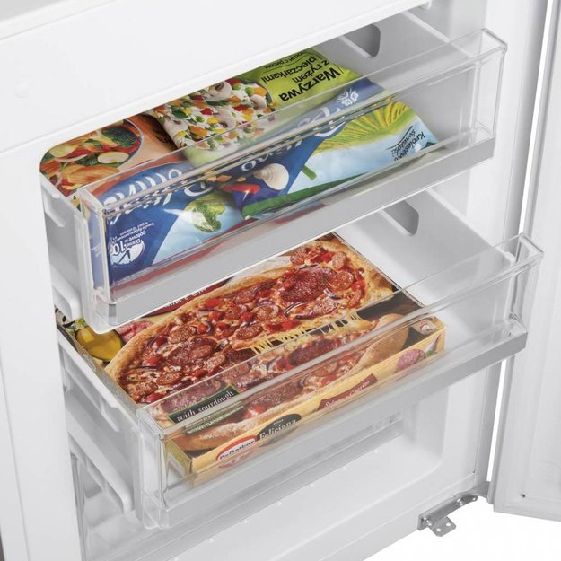 Внутреннее наполнение холодильной камеры составляют четыре полки из закаленного стекла с металлической окантовкой. Их можно извлечь или отрегулировать по высоте для размещения в камере продуктов большого размера. В нижней части холодильной камеры находятся выдвижной контейнер для фруктов и овощей и зона свежести. Морозильная камера содержит три прозрачных пластиковых выдвижных ящика с охлаждающим элементом под каждым из них. Производительность замораживания составляет 2,5 кг в сутки. При отключении электропитания возможно автономное сохранение холода в течение 14 часов. Холодильник отличается низким энергопотреблением класса А+ и малым уровнем шума 39 дБ.
