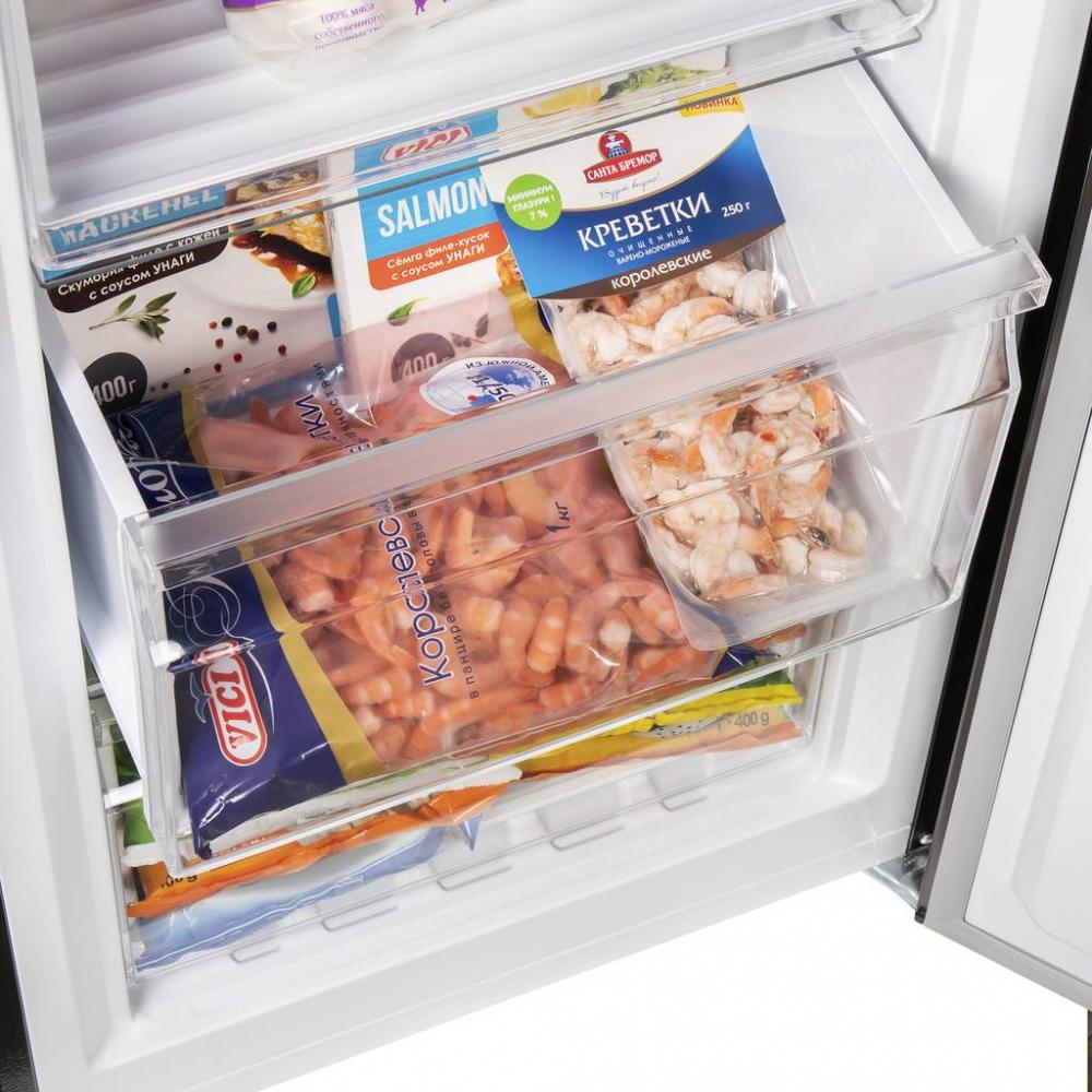 Внутреннее наполнение этого морозильника составляют две полки с крышками в верхней части, пять выдвижных ящиках из прозрачного нетоксичного пластика в нижней и две узкие полочки для мелких упаковок на дверце. Для лучшего обзора содержимого предусматривается яркое и экономичное светодиодное освещение. Система размораживания No Frost предотвращает появление льда на стенках, так что очистка их занимает минимум времени.