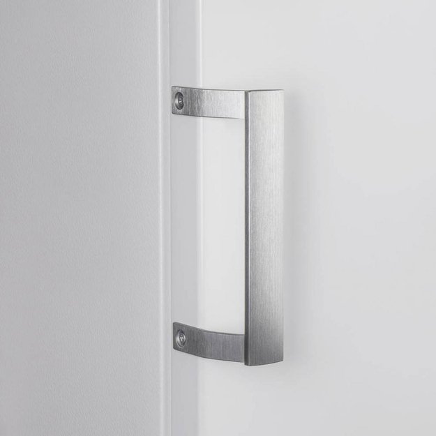 Продукты в камере можно разместить на двух полках и в четырех выдвижных ящиках из прозрачного безопасного пластика. Отличительная особенность этой морозильной камеры — две полки на дверце, которые подойдут для размещения мелких упаковок. Фасад изготовлен из металла с белым эмалевым покрытием. Стенки камеры изнутри обработаны антибактериальным составом, благодаря которому там отсутствуют неприятные запахи и плесень, а для очистки достаточно протереть поверхность влажной губкой. Легкой очистке способствует и система размораживания NoFrost, препятствующая появлению льда на стенках.