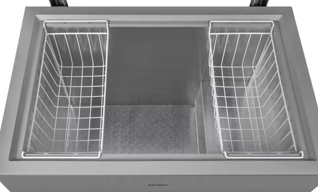 Внутренняя камера морозильного ларя, как правило, не содержит полок, ящиков и других подобных разделителей — это большой цельный отсек, в котором сверху могут крепиться металлические сетчатые корзины. Такая конструкция позволяет максимально увеличить вместительность устройства.