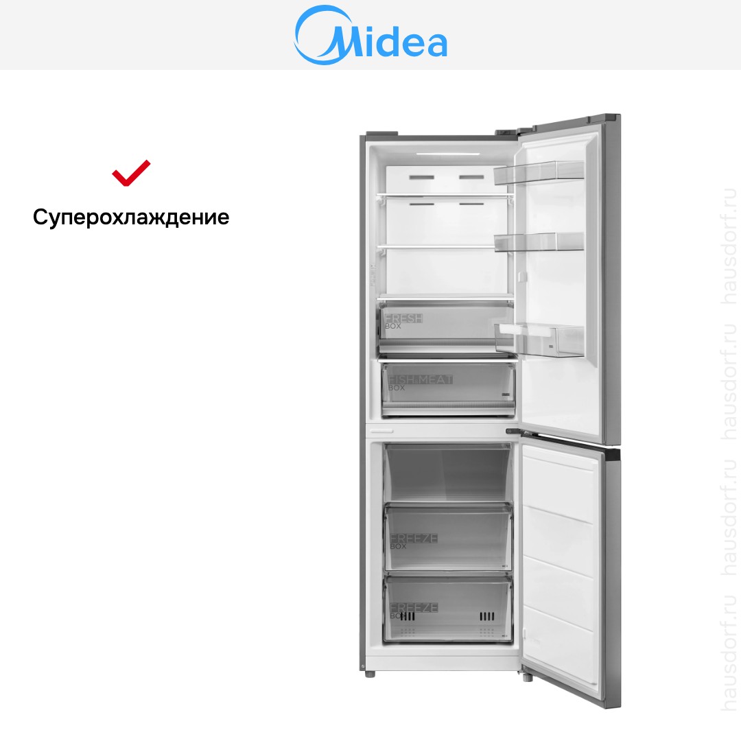 Холодильник Midea MDRB471MGF46O — стильный двухкамерный агрегат с нижней морозильной камерой и корпусом в цвете нержавеющей стали. Его строгий внешний вид легко вписывается в современную кухню и придаёт интерьеру аккуратный профессиональный штрих. Металлическая поверхность устойчива к отпечаткам и проста в уходе, что делает внешний вид аккуратным даже при интенсивной эксплуатации.