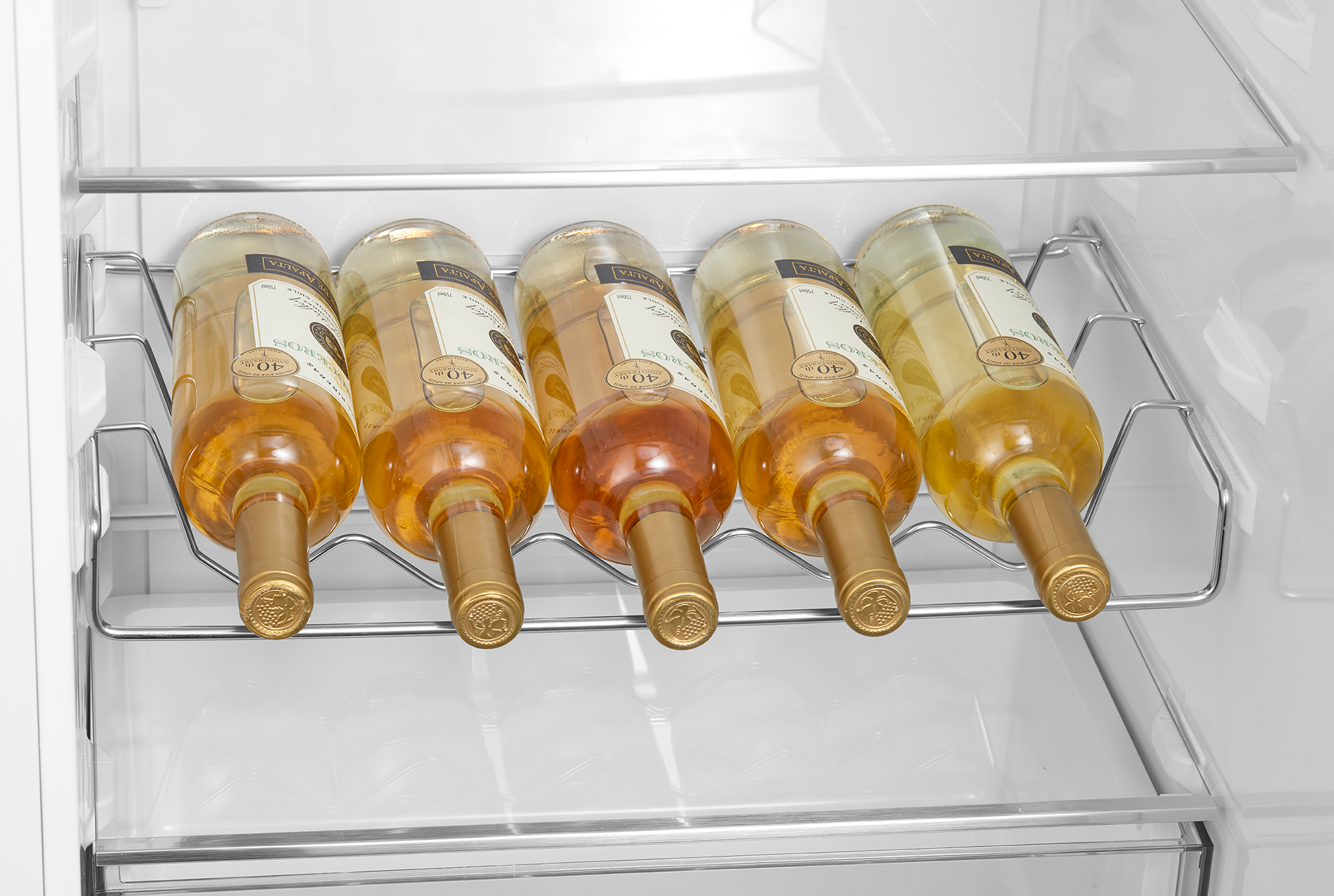 Для стеклянных бутылок, особенно винных и содержащих другие алкогольные напитки, предусматривается размещение на подвесной решетчатой металлической полке. Бутылки на ней располагаются в горизонтальном положении — это оптимальный способ хранения вин. Съемная металлическая полка легко моется под краном.