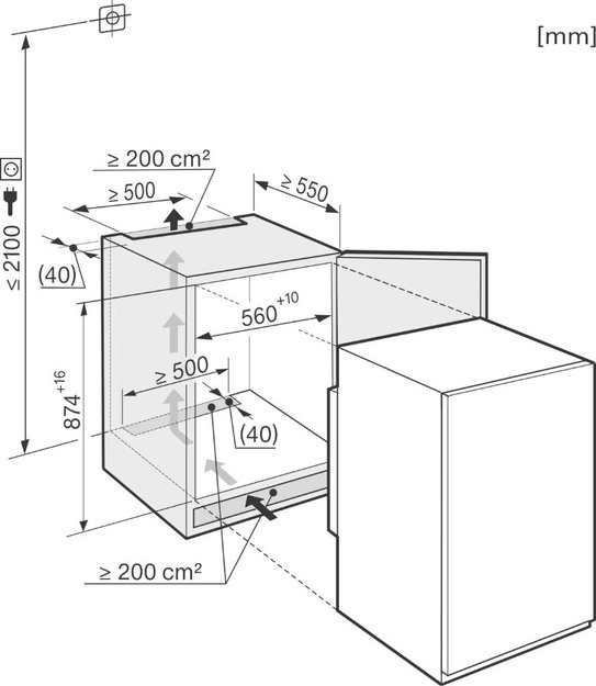 Встраиваемые холодильники монтируются в нишу или колонну. Передняя их часть закрывается декоративным мебельным фасадом и снаружи не отличается от дверцы обычного кухонного шкафа, так что их не нужно подбирать под интерьер помещения. Объем этих холодильников, как правило, несколько меньше, чем у отдельностоящих, так как при встраивании необходимо оставлять свободное пространство для вентиляции. Они отличаются меньшим уровнем шума, а также лучше держат холод и отличаются большей экономичностью из-за дополнительного слоя изоляции. Ассортимент этих холодильников не так велик, как у отдельно стоящих, установка более трудоемкая, а стоимость обычно несколько выше.