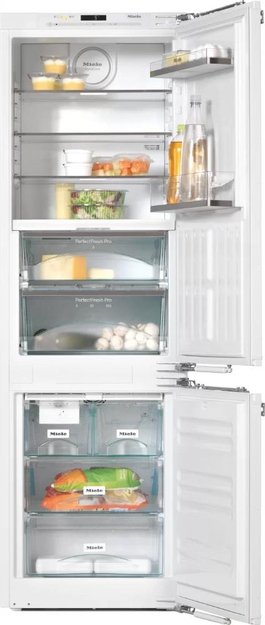 Встраиваемый холодильник-морозильник от Miele с общим объемом 233 литра. Специальное покрытие внутреннего пространства ComfortClean обеспечивает быструю очистку — высококачественные дверные полки легко моются в посудомоечной машине. А технология NoFrost предотвращает образование льда и избавляет от разморозки.