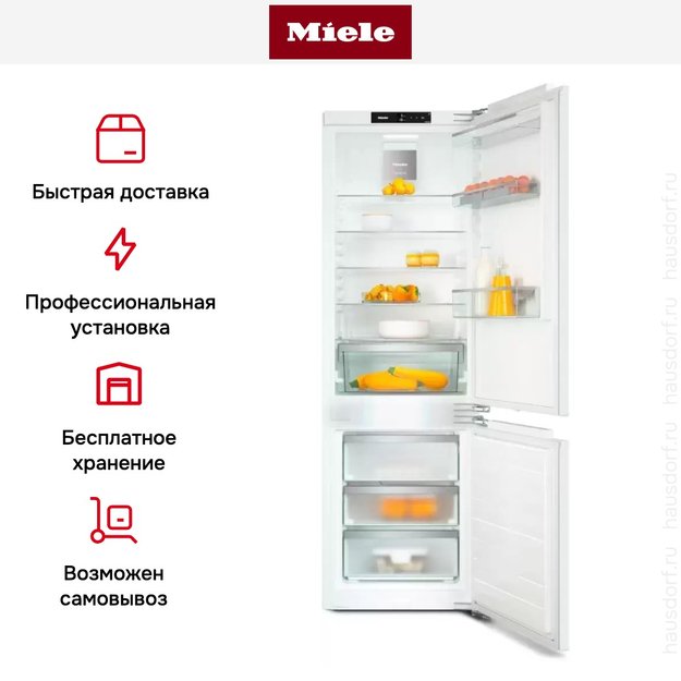 Встраиваемый холодильник Miele — это устройство, которое сочетает в себе стильный дизайн и функциональность. Морозильная камера расположена снизу, что обеспечивает удобство использования. Дверной упор справа обеспечивает удобство открывания, а доводчик двери позволяет избежать случайного открытия. Общий объем холодильника составляет 253 литра, из которых 183 литра занимает холодильная камера и 70 литров — морозильная. Устройство отличается климатическим классом SN-ST.
