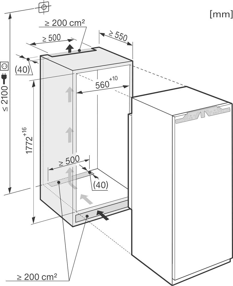 Встраиваемые холодильники монтируются в нишу или колонну. Передняя их часть закрывается декоративным мебельным фасадом и снаружи не отличается от дверцы обычного кухонного шкафа, так что их не нужно подбирать под интерьер помещения. Объем этих холодильников, как правило, несколько меньше, чем у отдельностоящих, так как при встраивании необходимо оставлять свободное пространство для вентиляции. Они отличаются меньшим уровнем шума, а также лучше держат холод и отличаются большей экономичностью из-за дополнительного слоя изоляции. Ассортимент этих холодильников не так велик, как у отдельно стоящих, установка более трудоемкая, а стоимость обычно несколько выше.