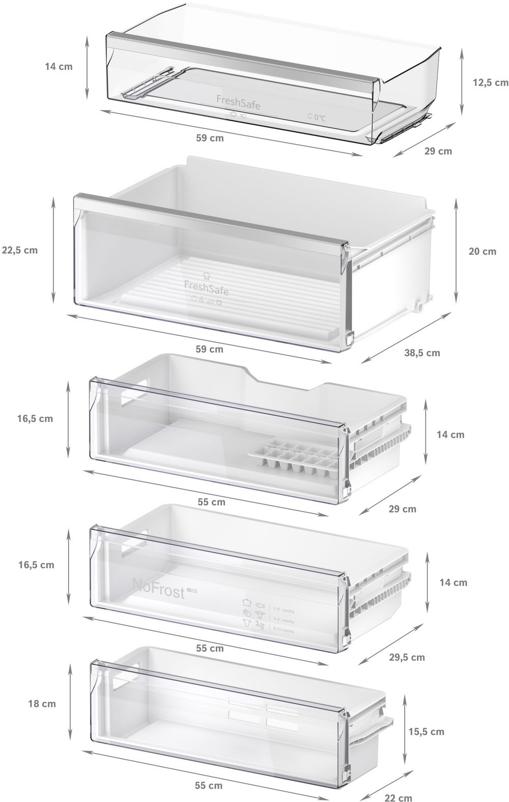 Трехкамерные модели выпускаются в нескольких вариантах. В некоторых случаях в качестве третьей камеры поступает так называемая зона свежести — отделение, где поддерживается температура около 0 градусов. В другом варианте подобные модели имеют морозильную камеру, состоящую из двух выдвижных ящиков.