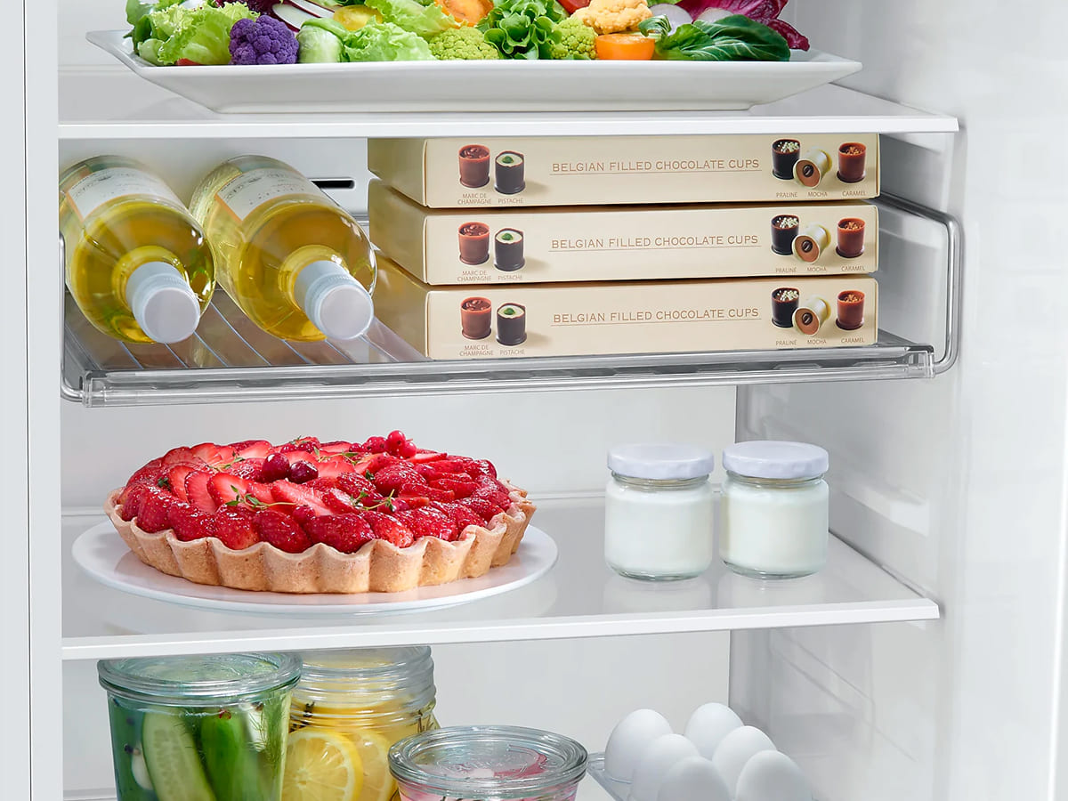 Специальная зона свежести предназначена для правильного и более длительного хранения овощей, фруктов, зелени. В ней поддерживается околонулевая температура, поэтому продукты не перемораживаются и не пересыхают.