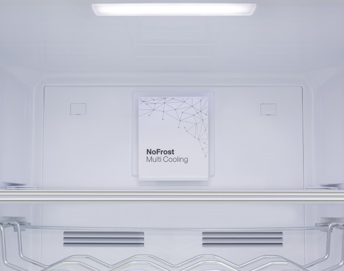 No Frost (Total No Frost, Frost Free): вентилятор обеспечивает циркуляцию охлажденного воздуха, благодаря чему лед не нарастает на стенке, а концентрируется только на скрытом внутри холодильника испарителе. Талая вода собирается в специальной емкости и испаряется. Такой холодильник не нужно размораживать – это экономит время и позволяет не останавливать прибор. Благодаря этим плюсам в современных моделях No Frost – самая распространенная система.