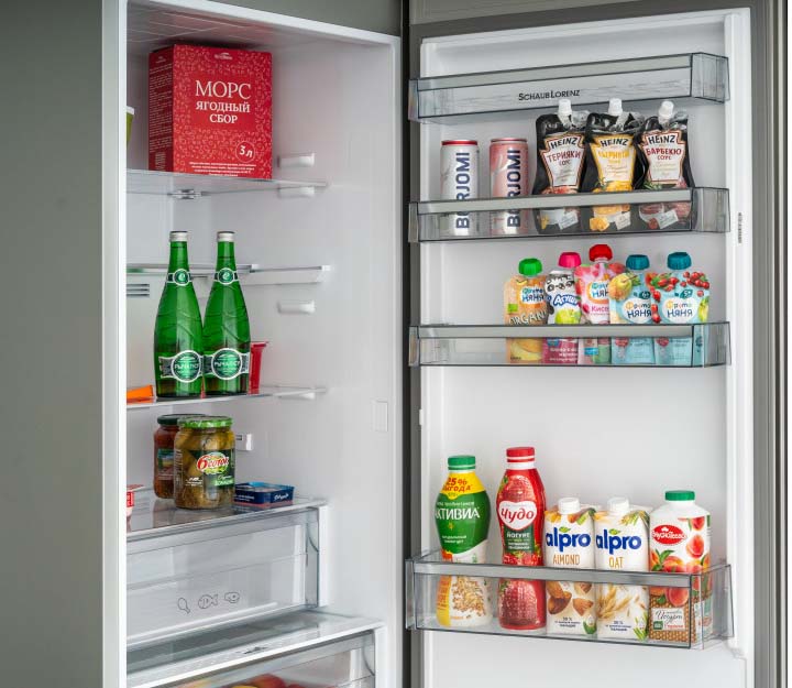 Отделение для бутылок в холодильной камере позволяет устойчиво и удобно размещать стеклянные и пластиковые бутылки, а также жидкости в таре из картона любого размера.