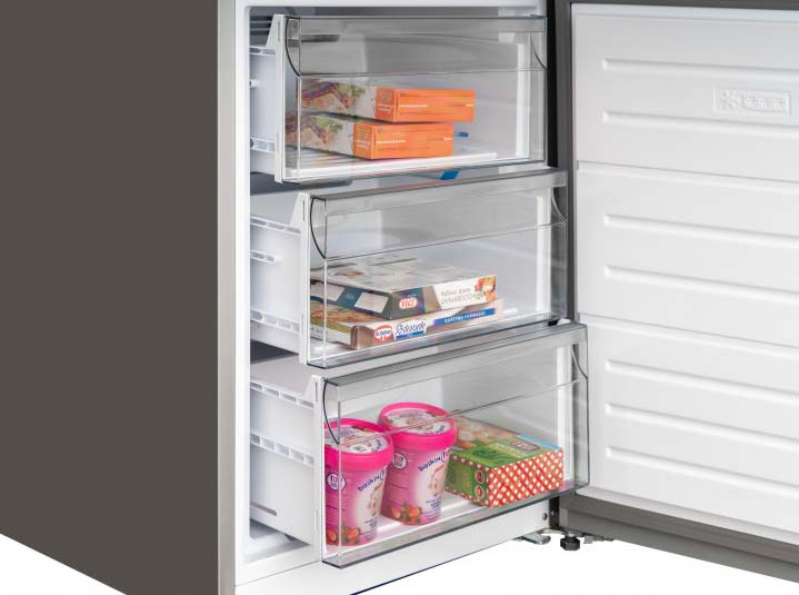 Трехкамерные модели выпускаются в нескольких вариантах. В некоторых случаях в качестве третьей камеры поступает так называемая зона свежести — отделение, где поддерживается температура около 0 градусов. В другом варианте подобные модели имеют морозильную камеру, состоящую из двух выдвижных ящиков.