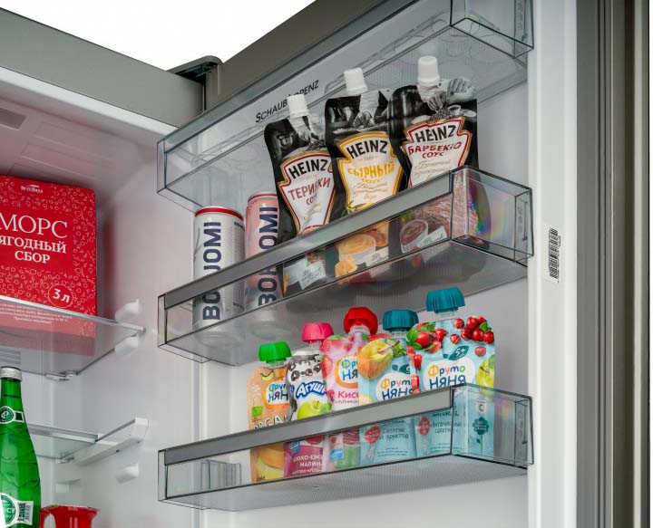 Ящики для продуктов изготавливаются либо целиком из прозрачного пластика, либо часто имеют переднюю прозрачную панель, которая обеспечивает лучший обзор. Полки в большинстве холодильников могут перемещаться по высоте, устанавливаются на специальных направляющих и без труда снимаются для очистки.