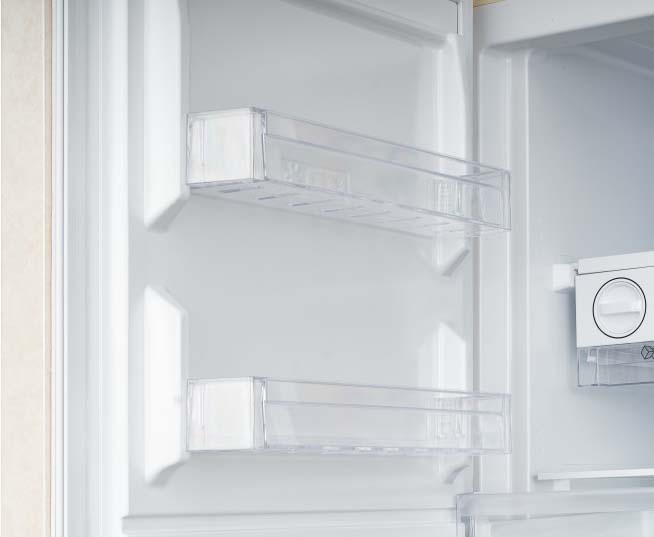 Встраиваемые холодильники монтируются в нишу или колонну. Передняя их часть закрывается декоративным мебельным фасадом и снаружи не отличается от дверцы обычного кухонного шкафа, так что их не нужно подбирать под интерьер помещения. Объем этих холодильников, как правило, несколько меньше, чем у отдельностоящих, так как при встраивании необходимо оставлять свободное пространство для вентиляции. Они отличаются меньшим уровнем шума, а также лучше держат холод и отличаются большей экономичностью из-за дополнительного слоя изоляции. Ассортимент этих холодильников не так велик, как у отдельно стоящих, установка более трудоемкая, а стоимость обычно несколько выше.
