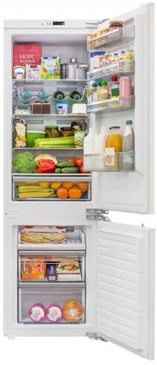 Внутреннее наполнение холодильной и морозильной камер включает многочисленные и разнообразные полки, ящики, контейнеры. Все они используются для более удобного и рационального размещения продуктов, которое обеспечивает хороший обзор содержимого холодильника и быстрый поиск.