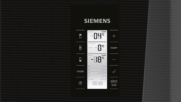 Гораздо точнее сориентироваться по индикаторам можно в холодильниках с электронной системой управления. Эти устройства обычно оснащены дисплеем, на котором высвечиваются значения фактической температуры в холодильной и морозильной камерах. Рядом с ними располагаются кнопки, во многих случаях сенсорные, при помощи которых можно регулировать температуру в каждой камере отдельно, и индикаторы включения этих камер. Здесь же, на панели инструментов, находятся индикаторы, указывающие на активацию дополнительных опций — например, режимов быстрого замораживания и быстрого охлаждения, отпускного режима, блокировки панели управления от детей.