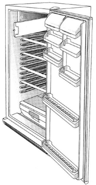 В нижней части обычно располагается полка, или балкон, для хранения бутылок. Выше имеется несколько полок для размещения консервов, йогуртов и тому подобных продуктов в таре из разных материалов. На самом верху располагаются закрытые полки, в которых можно хранить такие продукты, как яйца в специальных подставках, масло, сыр.