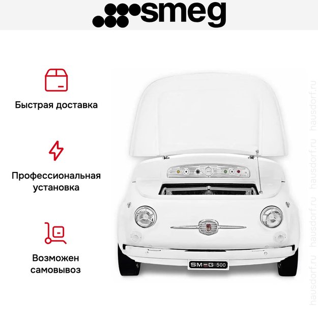Эксклюзивный отдельно стоящий мини-бар Smeg 500B в корпусе белого цвета представляет собой имитацию известного ретро-автомобиля Фиат-500. Модель из коллекции 50-х годов оснащена системой автоматического размораживания и системой охлаждения с обдувом. Камера объемом 100 литров позволяет разместить для охлаждения бутылки в специальных съемных держателях, жестяные банки, а также масло или сыр. Температура в камере регулируется при помощи термостата.