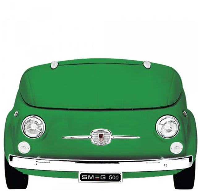 Минибар Smeg 500V в корпусе зеленого цвета сконструирован совместно с компанией Фиат в виде передней части автомобиля Фиат-500. Модель с камерой объемом 100 литров размораживается автоматически. Оснащена тремя съемными держателями для бутылок. Температура регулируется при помощи термостата.