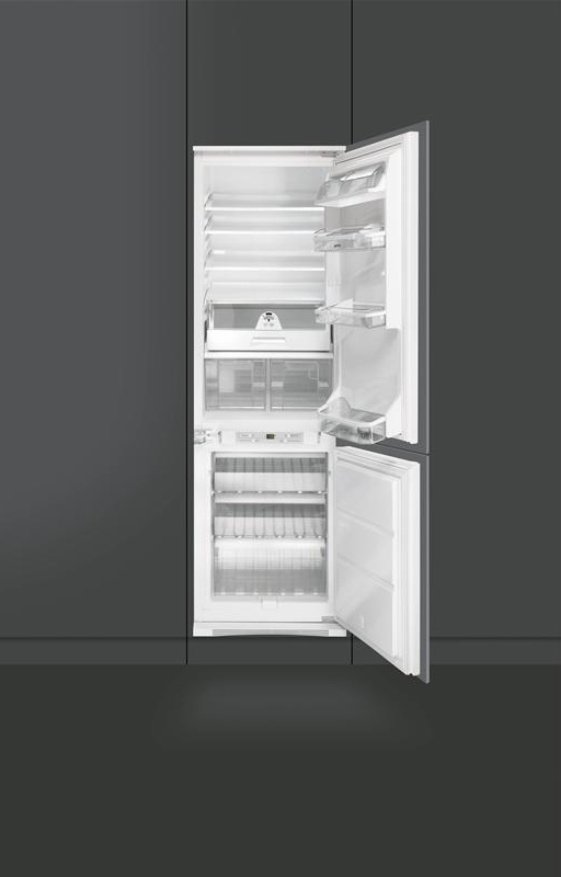 Встраиваемые холодильники монтируются в нишу или колонну. Передняя их часть закрывается декоративным мебельным фасадом и снаружи не отличается от дверцы обычного кухонного шкафа, так что их не нужно подбирать под интерьер помещения. Объем этих холодильников, как правило, несколько меньше, чем у отдельностоящих, так как при встраивании необходимо оставлять свободное пространство для вентиляции. Они отличаются меньшим уровнем шума, а также лучше держат холод и отличаются большей экономичностью из-за дополнительного слоя изоляции. Ассортимент этих холодильников не так велик, как у отдельно стоящих, установка более трудоемкая, а стоимость обычно несколько выше.