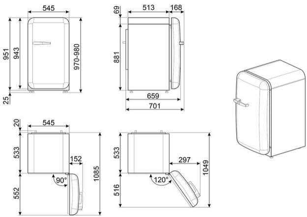 Диапазон размеров стандартных холодильников любой ширины и высоты может составить от 55 до 65-70 см. Иногда модели большей глубины, порядка 70 см, приобретаются для того чтобы скомпенсировать более строгое ограничение по ширине и увеличить вместимость. У мини-холодильников, которые размещаются под столешницей или в тумбе, глубина также меньше стандартной: она может составить минимум 48-50 см. Иногда в таких холодильниках часть глубины «съедает» расположенный в камере компрессор.