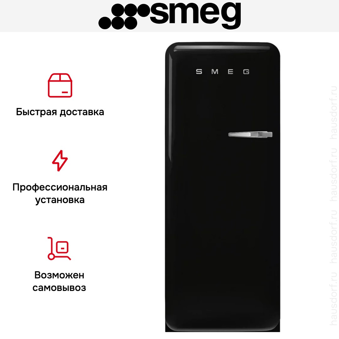 Холодильник Smeg FAB28LBL6. Как продавец-консультант отмечу, что это отдельностоящая модель с верхней морозильной камерой, выполненная в узнаваемом стиле 50-х годов и эффектном черном цвете. Внешняя ручка и левая сторона дверного упора подчеркивают винтажную эстетику, а при этом сохраняют удобство повседневного использования. Габариты 153×60.1×72.8 см делают прибор компактным вариантом для кухни средней площади, но при этом внутренняя вместимость вполне достаточна для семьи из двух-трех человек.