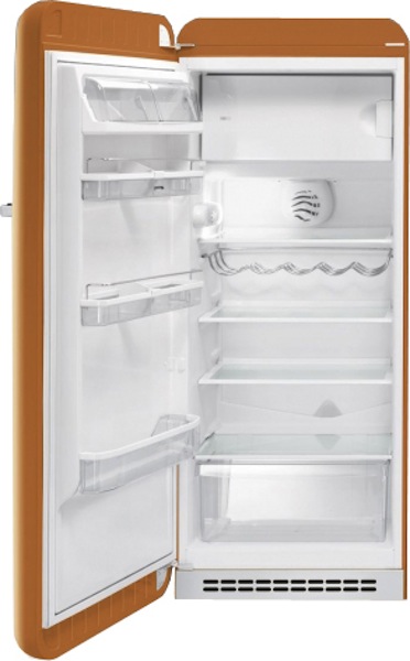 Если вы мечтаете о ярко-оранжевом холодильнике на вашей кухне, который способен в один момент поднять самое плохое настроение, то данная модель создана для вас. Управлять всеми параметрами работы очень просто благодаря специальной электромеханической системе управления. Размораживание холодильной камеры производится автоматически капельным путем. Освещение внутреннего пространства осуществляется посредством LED-подсветки. Выбирая место для данного холодильника, учитывайте, что его дверь навешивается с левой стороны.
