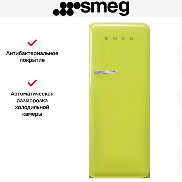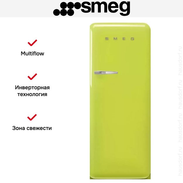 Холодильник Smeg FAB28RLI5 имеет приятный, нежный цвет лайма. Скругленный, выпуклый корпус и стиль 50-х годов дополняют образ. Прибор в таком оформлении сможет стать прекрасным дополнением современного кухонного гарнитура. Холодильная камера не требует самостоятельной разморозки. Благодаря вентилируемому охлаждению нас стенках прибора не образуется иней, лед и снежная шапка. Антибактериальное покрытие защищает поверхность устройства от образования бактерий и вредных микроорганизмов. Инверторный компрессор обеспечивает оптимальную работу холодильника. Особая система MultiFlow способствует более длительному хранению продуктов питания в свежем виде. Полки в камере можно отрегулировать по высоте. Контейнер для овощей и фруктов со стеклянной крышкой легко выдвигается на скользящих направляющих. При отключении электропитания холод сохраняется на протяжении 9 часов.