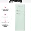 Холодильник Smeg FAB30RPG5 — отдельно стоящая модель из ретро-серии в стиле 50-х годов в корпусе пастельно-зеленого цвета. Вместительное устройство с двумя дверцами высотой 170 см имеет объем 298 литров.