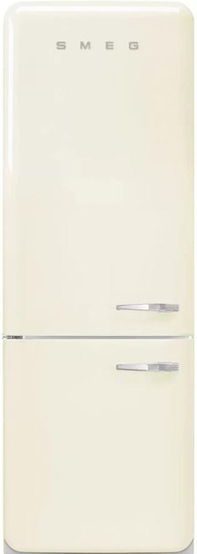 Двухкамерный холодильник в стиле 50-х выполнен в кремовом цвете, который подойдет интерьерам в светлых оттенках. Прибор работает с полным No Frost, который позволяет равномерно охлаждать или замораживать продукты без намерзания инея. Благодаря этой системе также проще ухаживать за холодильником, так как не нужно его размораживать. В холодильном отделении большинство полок регулируются по высоте, на них можно разместить посуду разного размера. Они сделаны из закаленного стекла, которые выдержат тяжелые блюда. В отдельной зоне сохранения свежести вы можете держать овощи, фрукты и зелень дольше, чем в обычном отсеке. В морозильном отсеке три вместительных ящика и ручной ледогенератор.