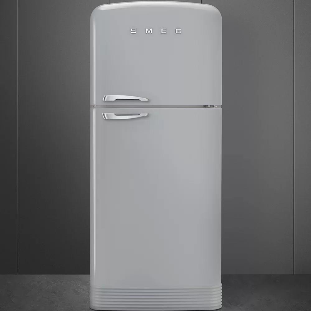 Вместительный и стильный холодильник итальянского бренда Smeg. Модель с двумя отделениями и морозильной камерой расположенной сверху.