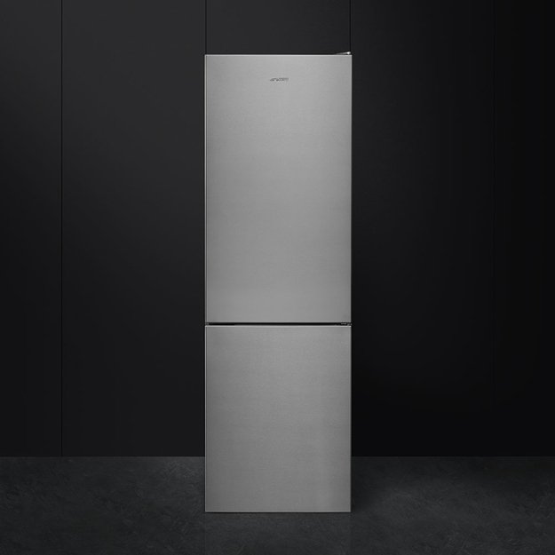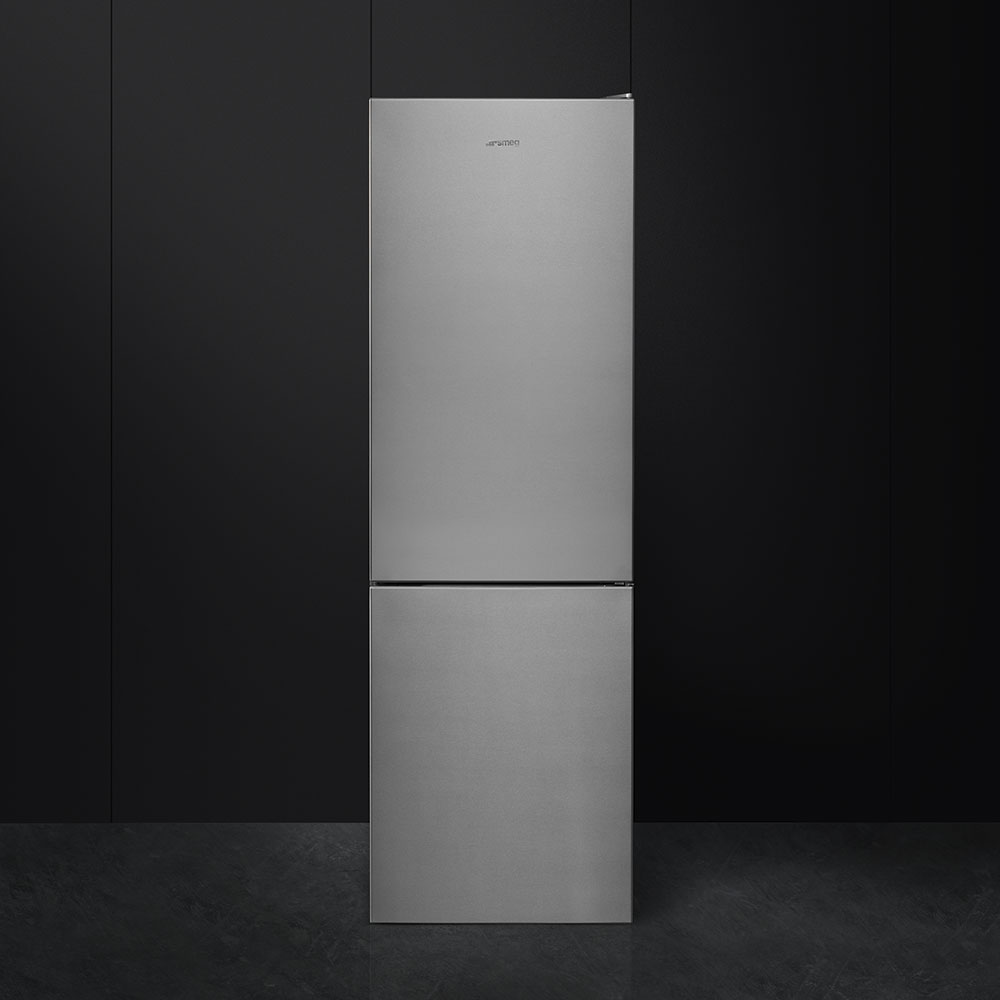 Двухкамерный холодильник с отдельным контейнером в зоне свежести и тремя выдвижными ящиками в морозильной камере. Двери можно перевесить на другую сторону. Поверхность обработана от отпечатков пальцев.