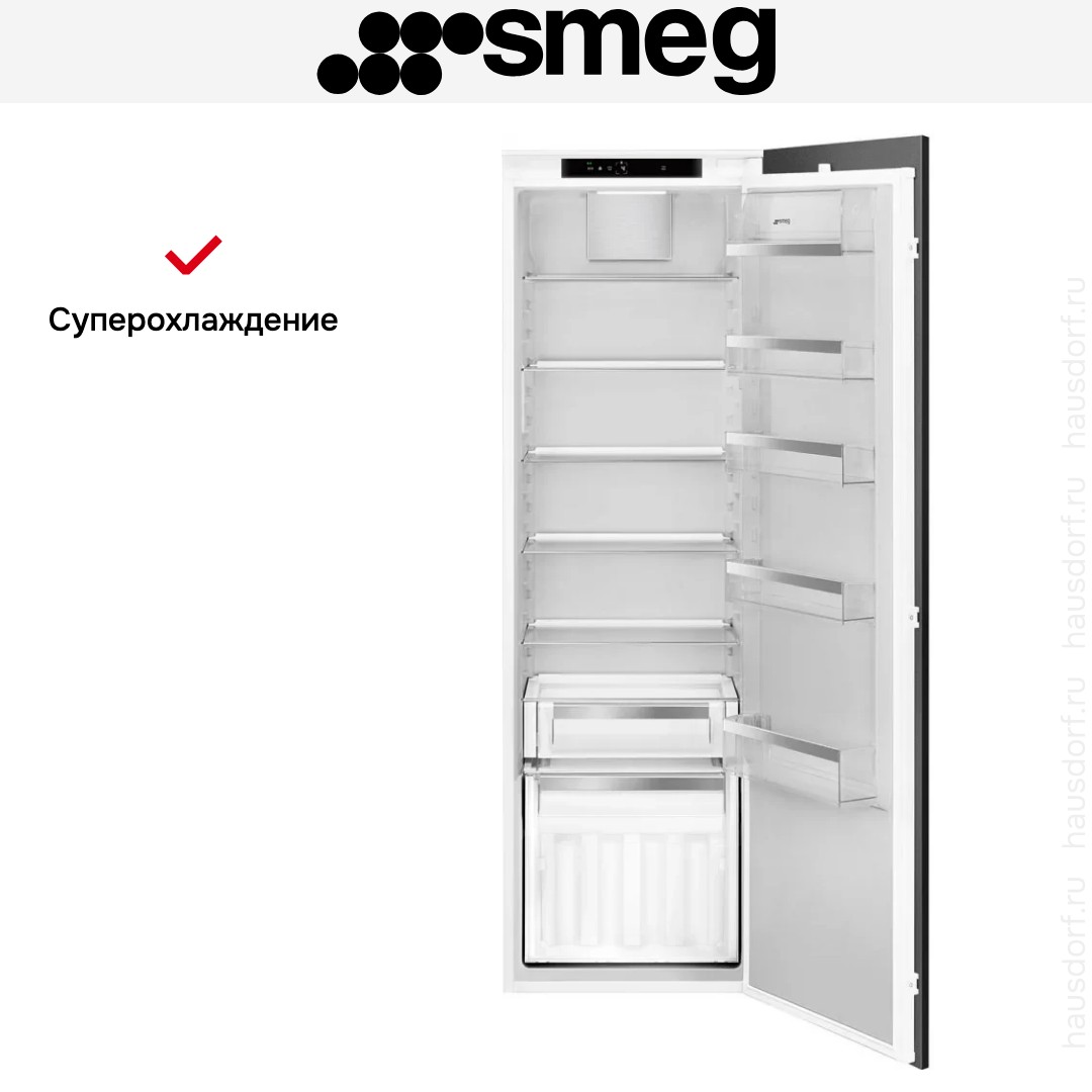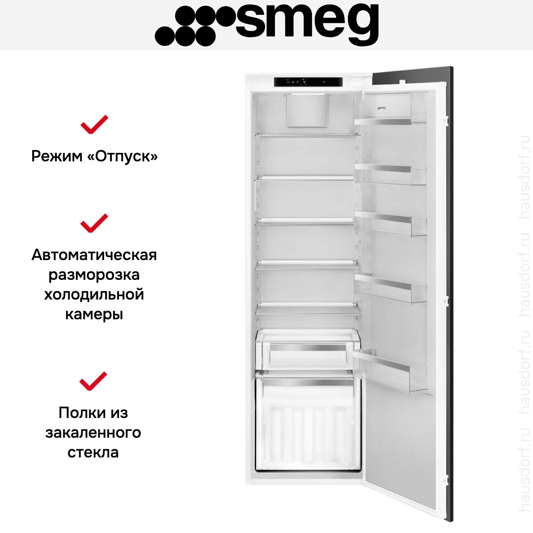 Встраиваемый холодильник Smeg S9L174D1D создаёт аккуратную и целостную картинку кухонного гарнитура благодаря системе door on door и возможности скрыть фасад под вашим навесом. Его габариты 178.4×55.7×54.9 см и ниша для встраивания 178.3×56×55 см рассчитаны на плотную, но удобную интеграцию в мебель. Жёсткое крепление двери обеспечивает ровный щит и надёжность эксплуатации, а перевешивание петель даёт свободу при планировке кухни и подгонке под расположение розеток или удобства прохода.
