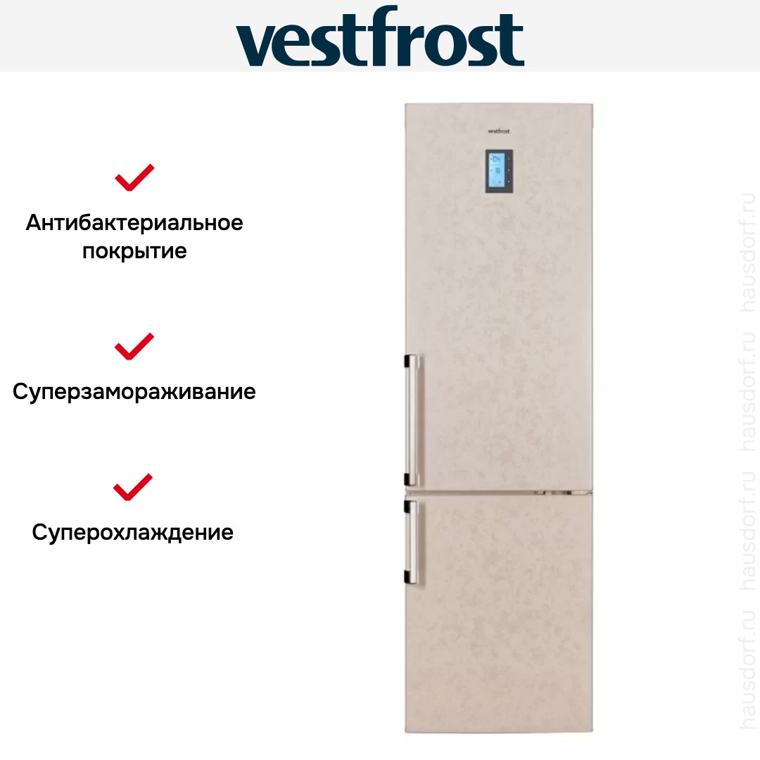 Vestfrost VF3863B — отдельностоящий холодильник с зоной свежести. Система NoFrost, препятствующая заиндевению камерных стенок, упрощает процесс обслуживания прибора.Электронная панель управления со внешним дисплеем позволяет точно установить и проконтролировать температуру в отделениях.