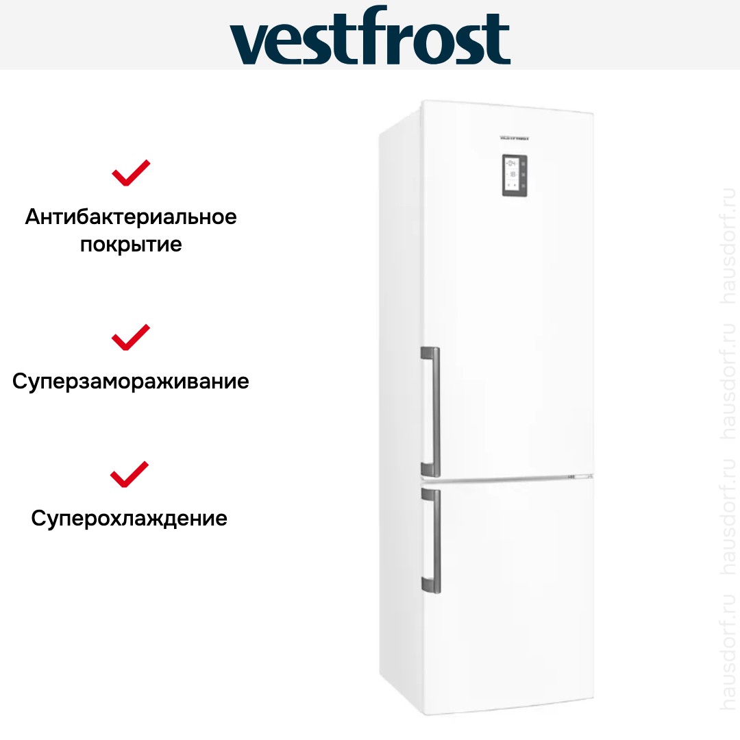 Vestfrost VF3863W — отдельностоящий холодильник в универсальном белом исполнении. Электронная панель управления с информативным дисплеем позволяет с легкостью установить необходимую температуру в обоих отделениях.