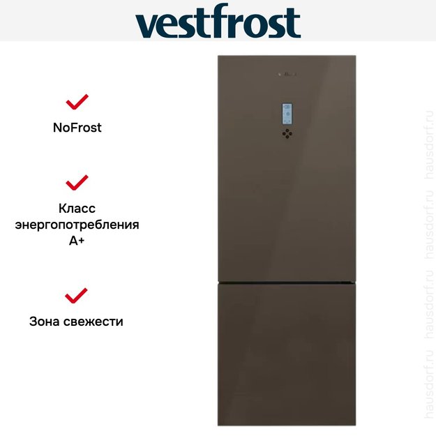 Модель Vestfrost с покрытием из коричневого стекла подойдет как классическому, так и современному интерьеру. Охлажденный воздух распределяется по камерам независимо благодаря системе Multi-flow. В одинаковых условиях находятся продукты у стенки и двери, а запахи не проникают из морозильника в верхнее отделение.