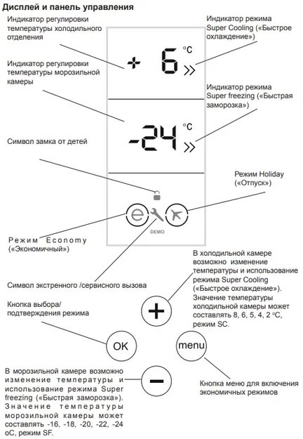 Цифровые дисплеи более простые — на них отображается температура в холодильной и морозильной камерах и выбранный режим — например, суперзамораживание, суперохлаждение, отпускной режим. Сюда же выводятся сообщения об ошибках. Текстовый дисплей дает пользователю больше возможностей и позволяет работать с меню, выбирая в нем те или иные опции.