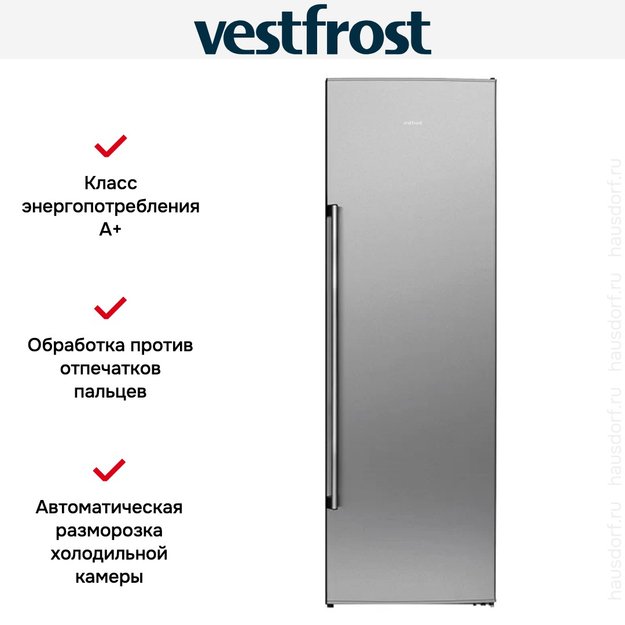 Vestfrost VF 395 SB — одноднокамерный холодильник в цвете нержавеющей стали. Рабочая камера модели укомплектована пятью стеклянными полками, «волной» для бутылок, а также двумя ящиками для размещения свежих фруктов и овощей. Дверцу устройства можно перенавесить, изменив тем самым сторону ее открывания.