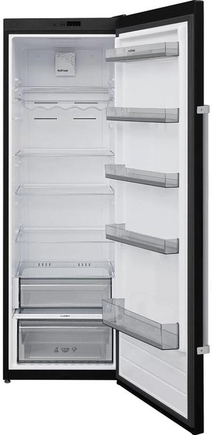 Холодильная камера имеет 5 стеклянных полок в самом отделении и 5 отсеков с бортиками на двери. Зона свежести достаточно вместительная, вы можете загрузить в нее овощи и зелень с расчетом на несколько дней — продукты дольше сохраняют питательные вещества, влагу и привлекательный внешний вид. Отдельная винная полка позволяет охлаждать до 4 бутылок.