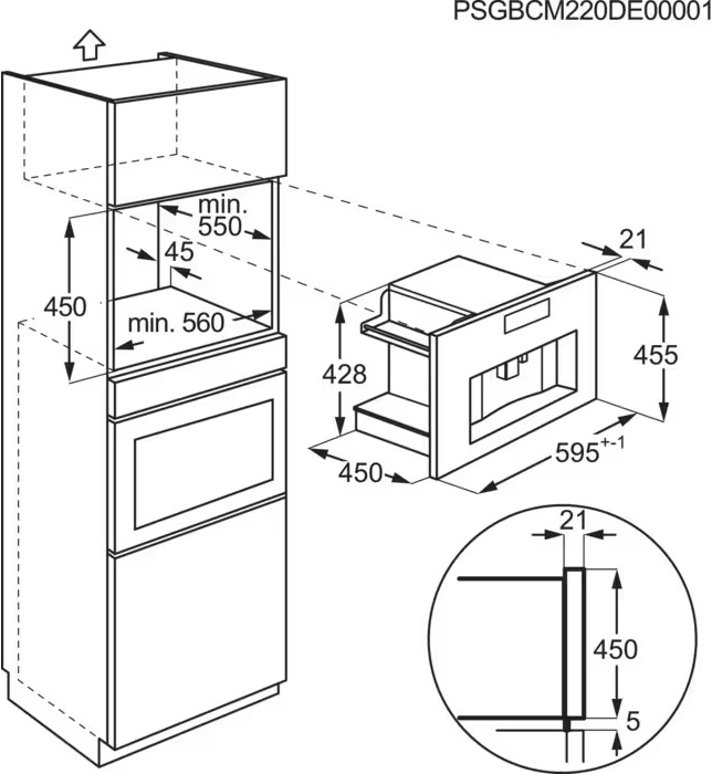 Габариты прибора — 45,5 см в высоту, 59,5 см в ширину и 45 см в глубину — соответствуют стандартным размерам кухонных ниш. Для корректной установки требуется ниша размером 45×56×55 см (Ш×В×Г), что делает интеграцию простой и безопасной. Встроенная модель не только экономит место, но и защищена от пыли и брызг, что продлевает срок её службы и упрощает уход.
