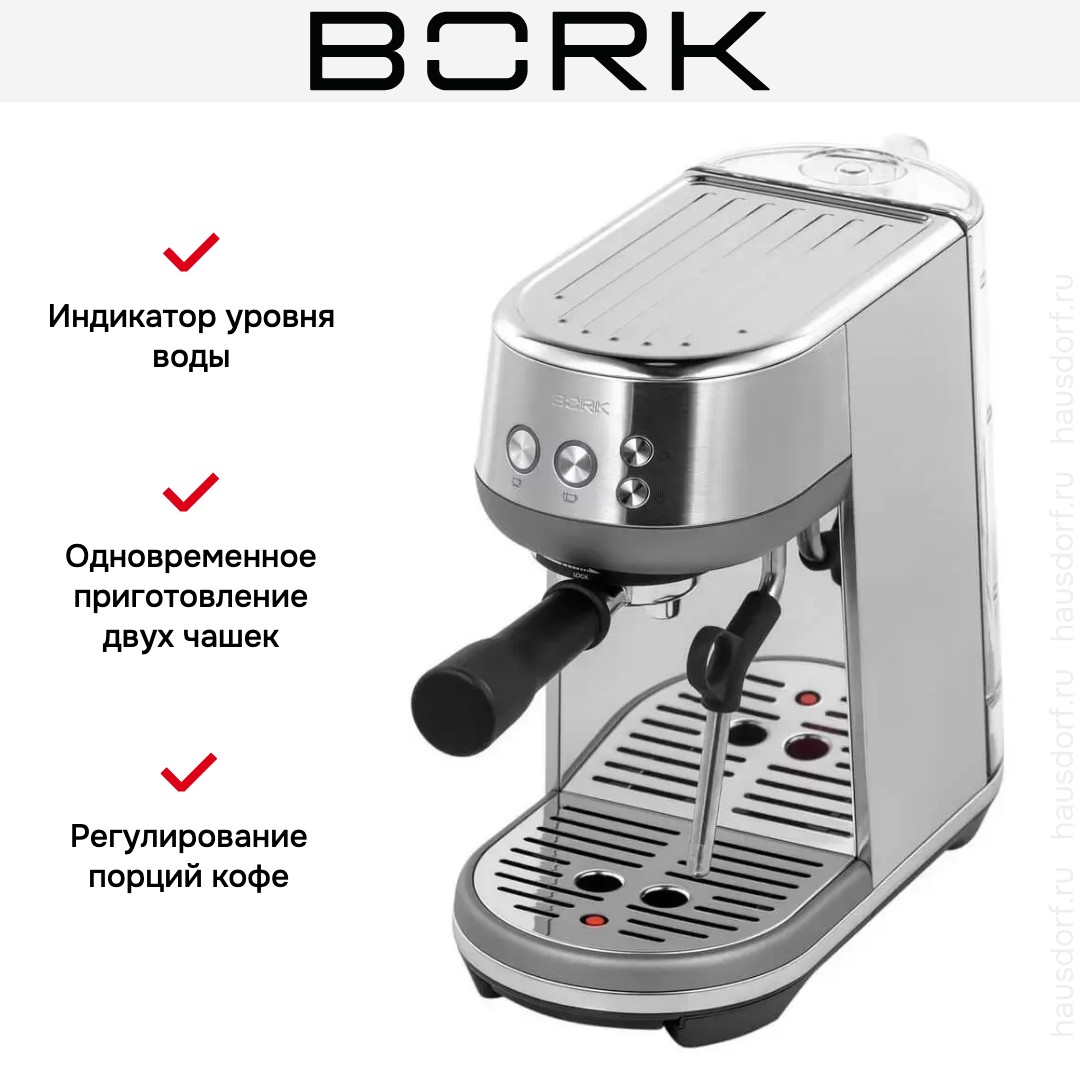 BORK C702 — кофеварка, которая открывает широкие возможности приготовления напитков желаемой крепости и объема. Корпус ее целиком изготовлен из нержавеющей стали и имеет соответствующий цвет: такая машина будет отлично смотреться в кухне современного стиля. Рожковые кофемашины требуют использования молотого кофе. Подготовка к приготовлению ведется вручную: пользователь должен поместить фильтр в держатель (портафильтр), засыпать туда определенное количество молотого кофе, а затем утрамбовать его при помощи темпера, который поставляется вместе с прибором. Затем портафильтр устанавливается в варочный узел и закрепляется там, после чего на панели управления выбирается желаемый режим приготовления. Кофеварка оборудована термоблоком для быстрого нагрева воды. Давление пара 15 бар гарантирует получение насыщенного и ароматного напитка.