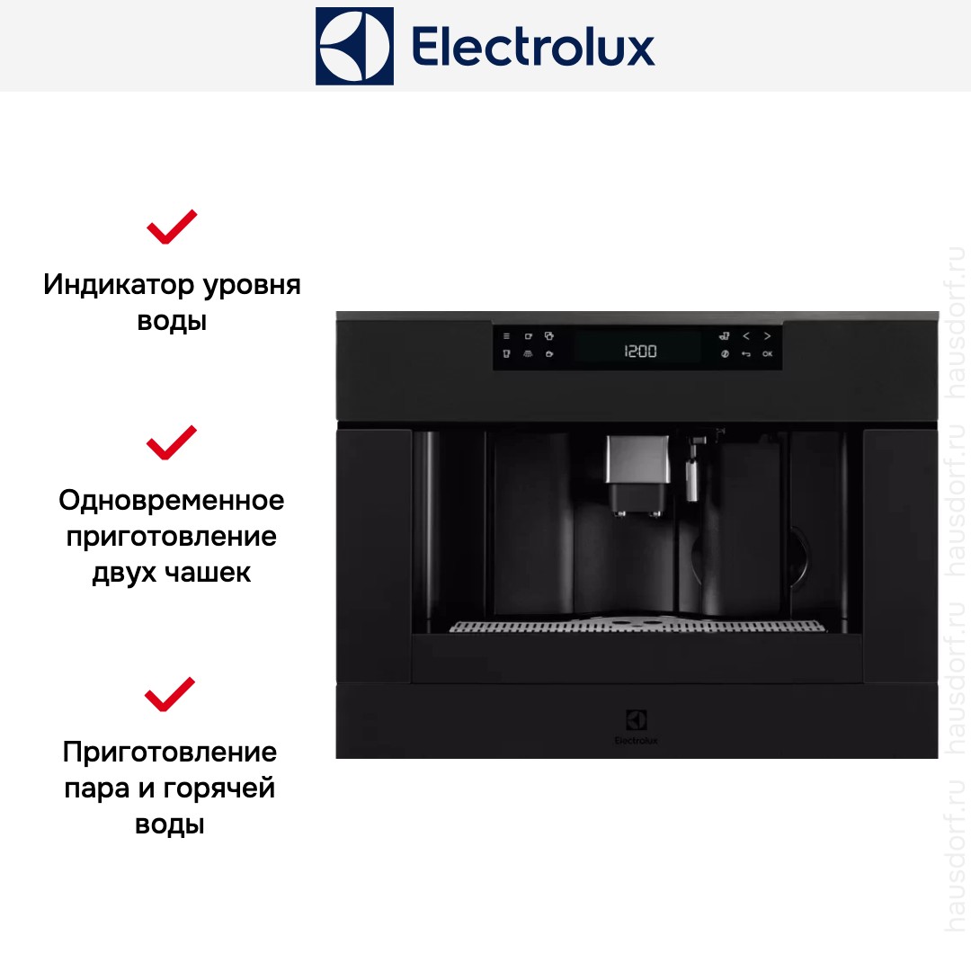 Регулирование порции горячей воды в кофемашинах Electrolux позволяет пользователю задать требуемое количество напитка. Заводские настройки предусматривают автоматическую подачу 200 мл горячей воды. Этот параметр можно изменить и сохранить в памяти при помощи сенсорного меню панели управления.