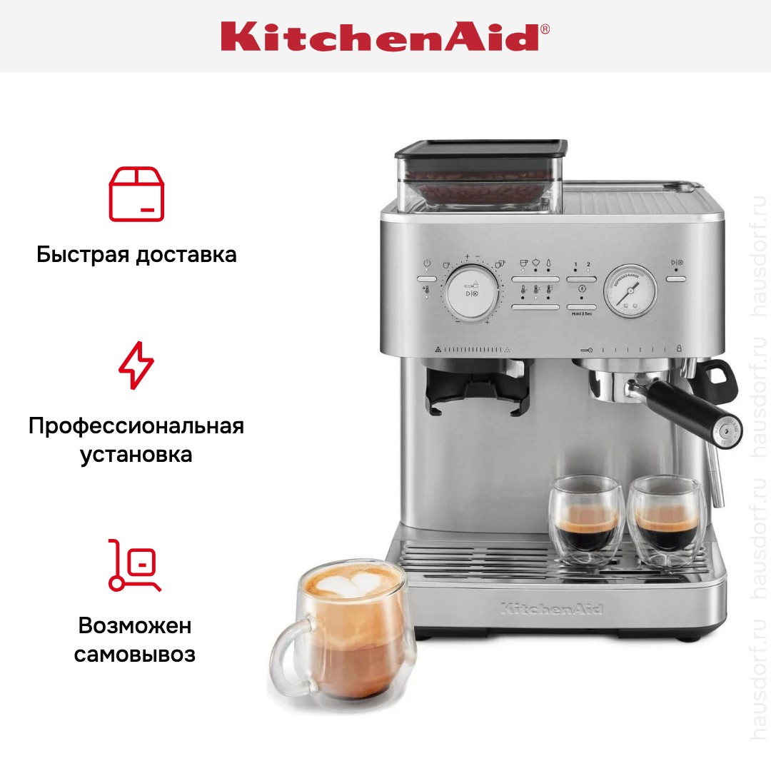 В модели KitchenAid 5KES6551ESX используются сразу два типа кофе — молотый и зерновой: это расширяет ваши возможности и увеличивает разнообразие напитков, которые можно приготовить с отличиями в крепости, ароматности и терпкости. Данная рожковая кофемашина предназначена в основном для приготовления эспрессо и капучино; благодаря быстрой работе и отсутствию кофейной взвеси в чашке она востребована как в быту, так и в офисах.